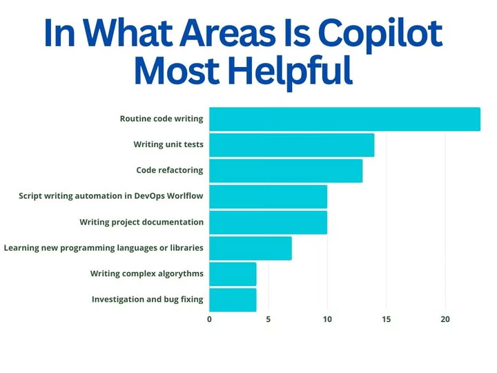 Alt text: Bar chart showing Copilot is most helpful for routine code writing, unit tests, and code refactoring.